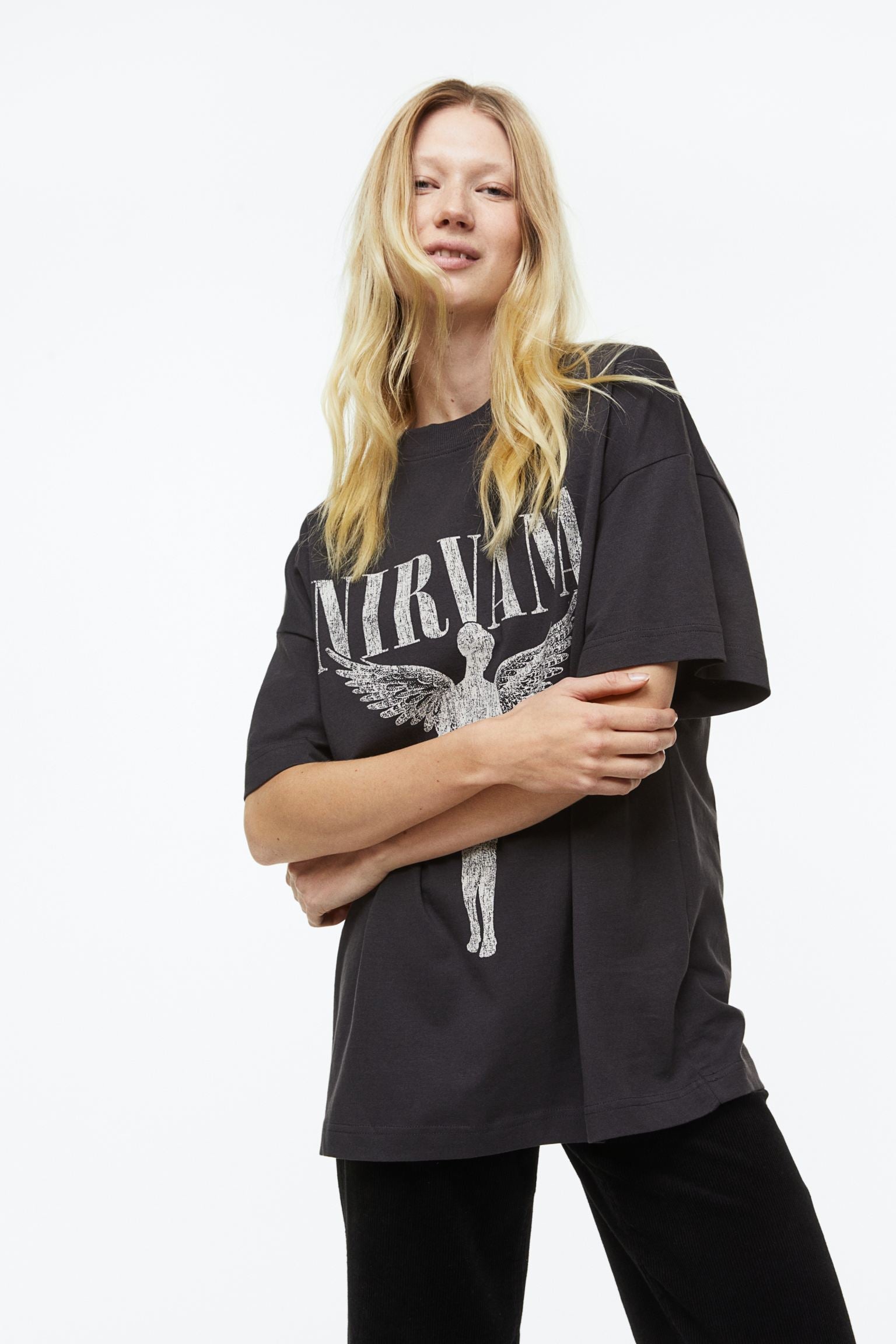 Black cotton womens top, with long sleeves, no collar and a thick hem.